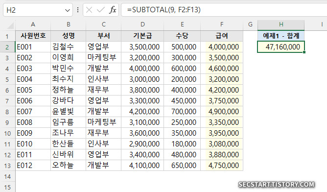 실무 포인트: 특정 부서 직원만 보고 싶을 때 부서 컬럼을 필터링하면 해당 부서의 급여 합계만 자동으로 계산돼요!