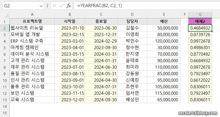 =YEARFRAC(입사일, TODAY(), 1) - 프로젝트 기간: