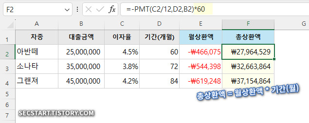 =-PMT(C2/12,D2,B2)*60 // 월상환액 * 총개월수 60 = 총상환액