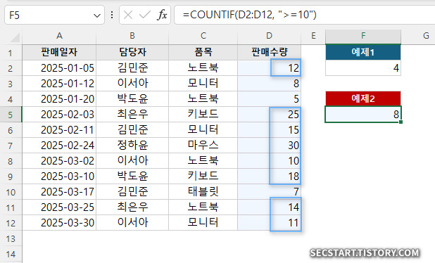 결과: 8 ( D2:D12 범위에서 10 보다 크거나 같은 값을 가진 셀 8개의 개수를 반환합니다. )