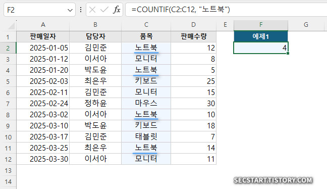 결과: 4 ( C2:C12 범위에서 "노트북" 이라는 텍스트를 가진 셀 4개의 개수를 반환합니다. )