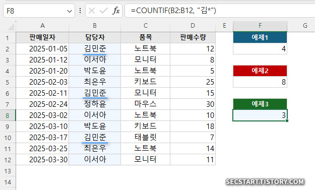 결과: 3 ( C2:C12 범위에서 "김"으로 시작하는 이름(김민준)을 가진 셀 3개의 개수를 반환합니다. )
