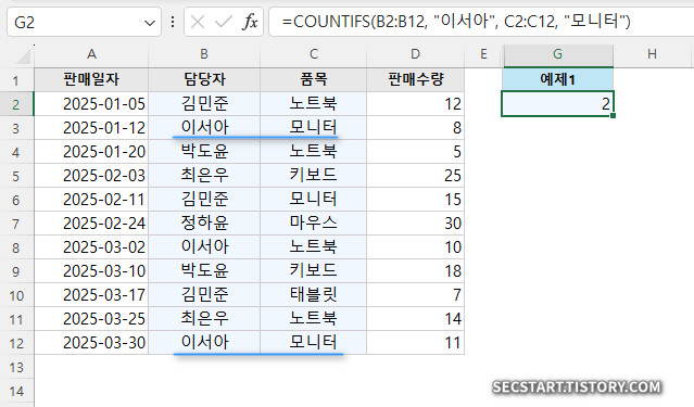 결과: 2 (담당자가 "이서아"이면서 동시에 품목이 "모니터"인 경우는 2건입니다.)
