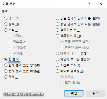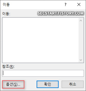 - 이동 > 옵션 창에서 '빈 셀' 을 선택하고 확인 을 누릅니다.