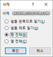 - 삭제 창에서 '행 전체'를 선택하고 확인 을 누릅니다.