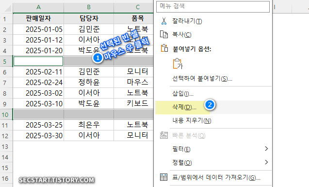 - 선택된 빈 셀 위에서 마우스 오른쪽 버튼 클릭 → 삭제 를 선택합니다.