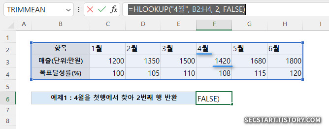 =HLOOKUP("4월", B2:H4, 2, FALSE)