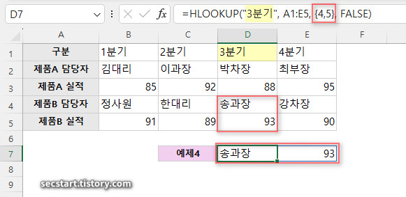 =HLOOKUP("3분기", A1:E5, {4,5}, FALSE)