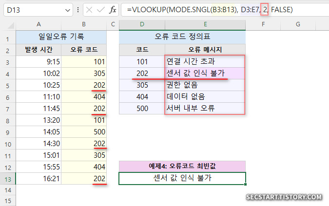 (1) MODE.SNGL(B3:B13): 먼저 '일일 오류 기록' 에서 가장 자주 발생한 오류 코드(최빈값)를 찾습니다. 위 데이터에서는 '202' 가 4번으로 가장 많이 발생했으므로, 202 를 결과로 반환합니다.