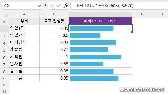 여기서 *20 은 막대의 길이를 조절하는 역할을 해요. 셀 너비에 맞게 숫자를 조절해 보세요. 결과물만 봐도 어떤 부서가 실적이 좋은지 바로 알 수 있겠죠?