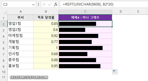 보고서에 차트를 넣기에는 부담스럽고, 숫자로만 보여주기엔 밋밋할 때가 있죠? UNICHAR와 REPT 를 이용하면 셀 안에 데이터를 시각화하는 미니 그래프를 만들 수 있어요.