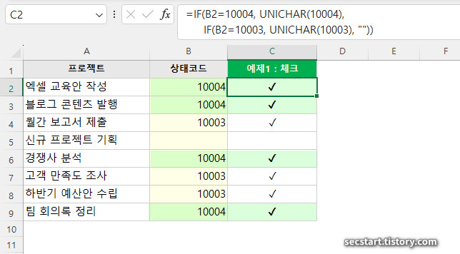 - 상태 표시: =IF(A1="완료", UNICHAR(10004), "") → ✔ 표시