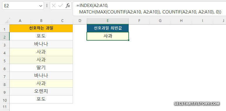 =INDEX(범위, MATCH(MAX(COUNTIF(범위, 범위)), COUNTIF(범위, 범위), 0))