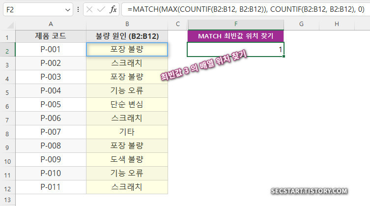 - 최종 결과: B2:B12의 첫 번째 값인 "포장 불량" 이 반환됩니다.