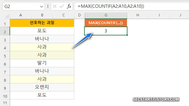 - MAX(COUNTIF(...)): 위 COUNTIF 가 만든 가상 배열 {2; 2; 3; 3; 1; 2; 3; 1; 2} 에서 가장 큰 값, 즉 3 을 찾아냅니다.