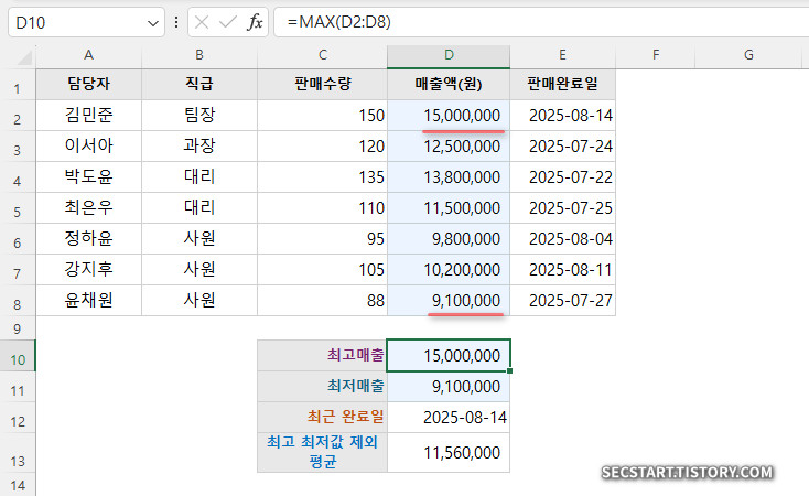 =MAX(D2:D8) // 매출액 최고값 계산