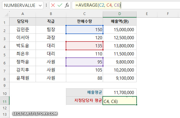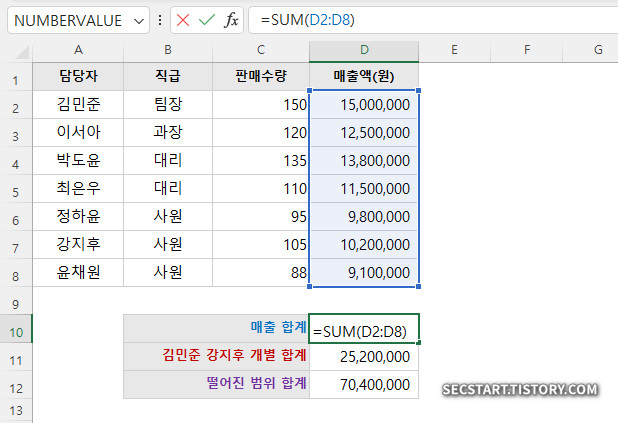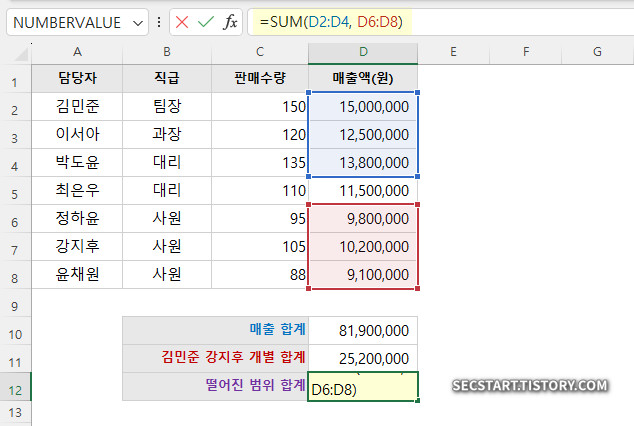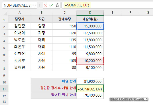 팀장(김민준)과 핵심 사원(강지후)의 매출액만 따로 더하고 싶다면? 쉼표(,)를 사용해 각 셀을 지정해주면 돼요.