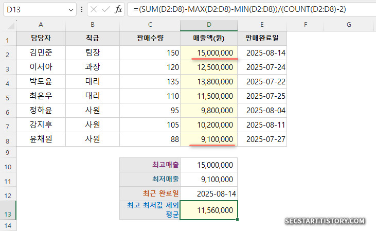 예제3. 상위/하위 값 제외하고 계산하기