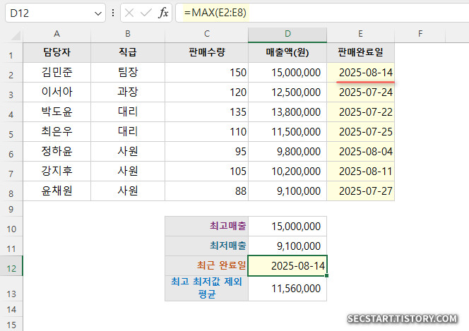 =MAX(E2:E8) //추가된 판매완료일 필드의 최근 날짜 계산