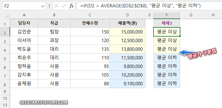 =IF(D2 > AVERAGE($D$2:$D$8), "평균 이상", "평균 이하")
