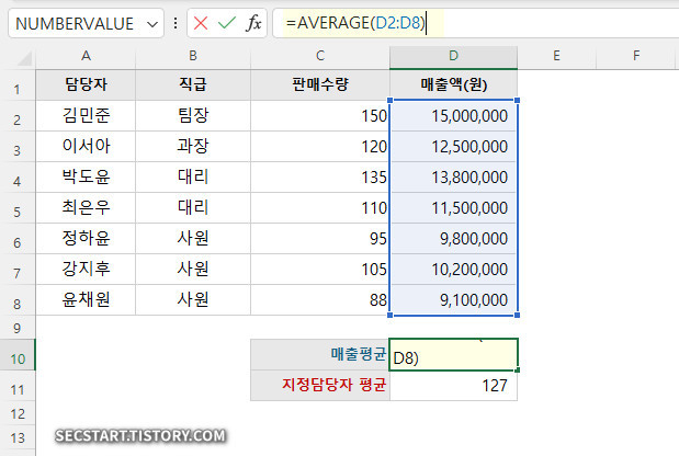 평균 매출액(AVERAGE(D2:D8))보다 높은 매출을 기록한 사람을 확인할 때 IF 함수와 함께 사용할 수 있어요.
