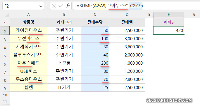 =SUMIF(A2:A9, "*마우스*", C2:C9)
