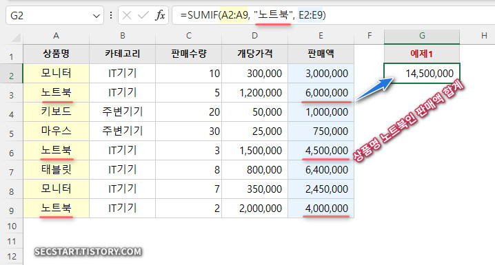 =SUMIF(A2:A9, "노트북", E2:E9)