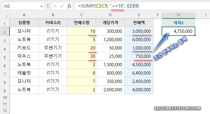 - E2:E9 (sum_range): 조건에 맞는 행의 '판매액' 을 더합니다.