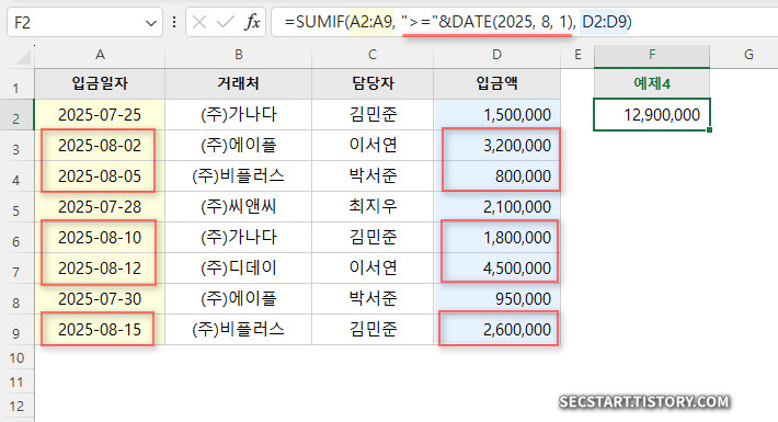 실무에서는 날짜 조건을 정말 많이 사용하죠. 2025년 8월 1일 이후의 입금액 합계를 구해봅시다.