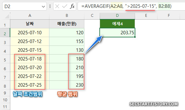 실무에서는 날짜 조건을 정말 많이 사용하죠. 2025년 7월 15일 이후의 매출 평균을 계산해 볼게요.