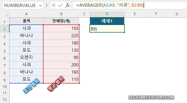 =AVERAGEIF(A2:A9, "사과", B2:B9)