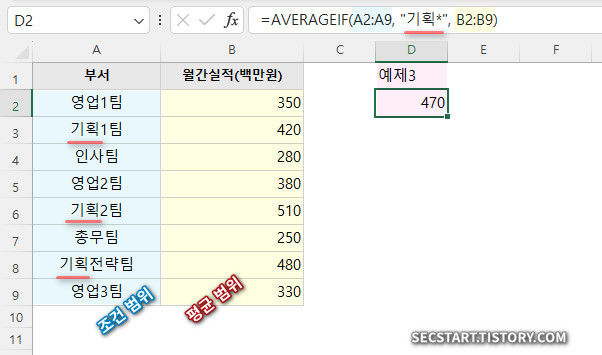 =AVERAGEIF(A2:A9, "기획*", B2:B9)