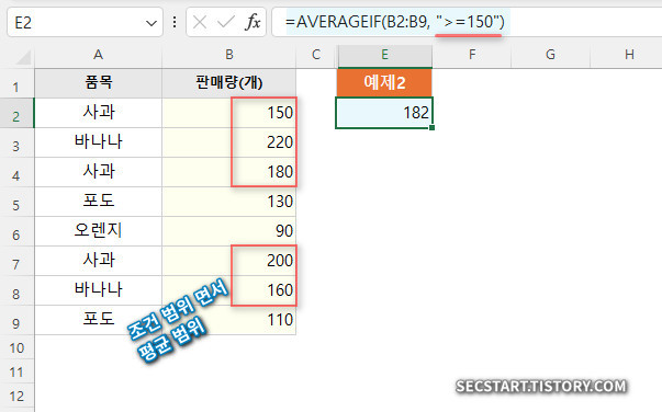 - B2:B9 범위의 값들 중에서 ">=150" (150 보다 크거나 같다) 이라는 조건을 만족하는 값들의 평균을 구해요.