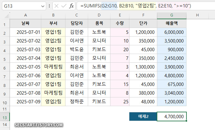 =SUMIFS(G2:G10, B2:B10, "영업2팀", E2:E10, ">=10")