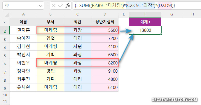 {=SUM((B2:B9="마케팅")*(C2:C9="과장")*(D2:D9))} // 중괄호 안의 수식 입력하고 CTRL+SHIFT+ENTER