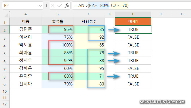 출석률이 80% 이상이고, 시험 점수가 70점 이상인 경우에만 '수료(TRUE)' 로 표시하고 싶어요.