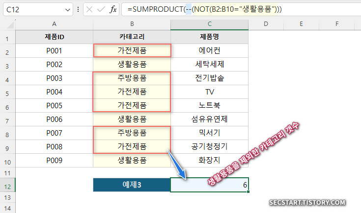=SUMPRODUCT(--(NOT(B2:B10="생활용품")))
