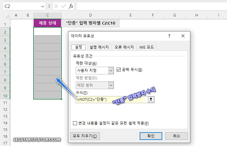 ㄱ. '단종' 입력 방지를 적용할 셀 범위(예: C2:C10)를 선택하세요.