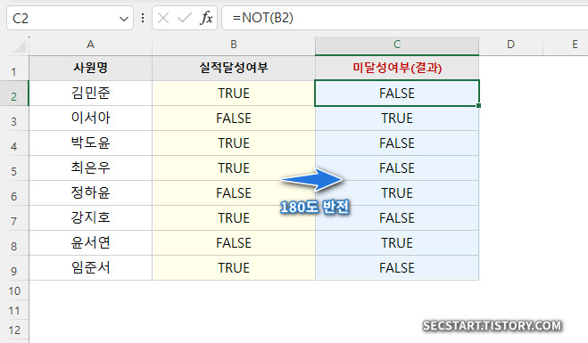 결과: 실적달성여부(B열)가 TRUE이면 FALSE를, FALSE이면 TRUE를 반환해서 '미달성'인 사람만 정확히 골라낼 수 있어요.