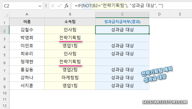 설명: NOT(B2="전략기획팀") 부분은 "B2셀이 '전략기획팀'이 아니라면" 이라는 뜻이 돼요. 이 조건이 참(TRUE)이면 "성과급 대상"을, 거짓이면 빈칸("")을 표시해 줍니다.