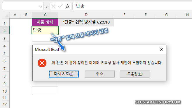 이제 해당 범위의 셀에 '단종'이라고 입력하면 오류 메시지가 뜨면서 입력이 차단됩니다. 데이터 관리의 정확성이 확 올라가겠죠?