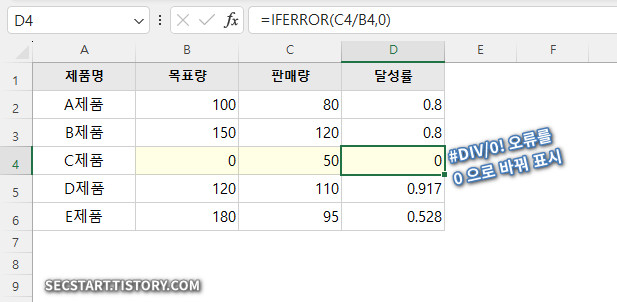 이제 IFERROR 함수를 사용해서 이 보기 싫은 오류를 깔끔하게 '0' 또는 특정 텍스트(예: "목표량 오류")로 바꿔보겠습니다.