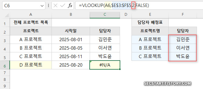 '전체 프로젝트 목록'에 있는 "D 프로젝트"가 우측의 '담당자 배정표'에는 누락된 상황을 가정해 보겠습니다. 이 경우, D 프로젝트의 담당자를 VLOOKUP 으로 찾으면 #N/A 오류가 발생합니다.