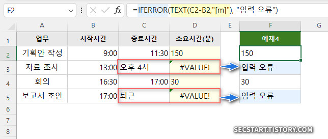 시간 형식(hh:mm)이 아닌 텍스트("오후 4시", "퇴근")가 입력된 셀 때문에 소요시간 계산 시 #VALUE! 오류가 발생합니다. 이걸 "입력 오류" 로 표시해 볼까요?