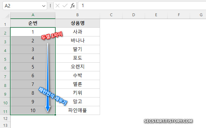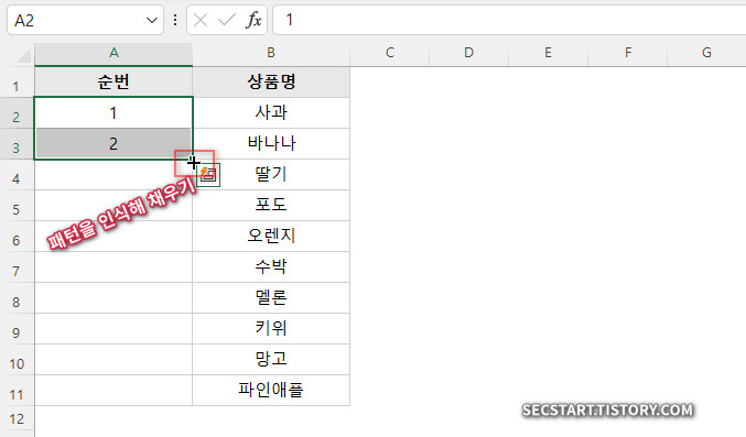 - 순서대로 채우려면?: 패턴을 알려주세요! 숫자 1, 2를 같이 선택하고 더블클릭하면 3, 4, 5... 가 자동으로 채워져요.
