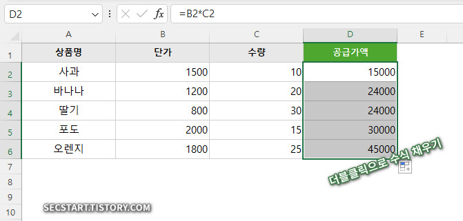 채우기 핸들 더블클릭의 진짜 위력은 수식 채우기에서 나타나요! 각 상품의 공급가액(단가 X 수량)을 계산해야 한다고 상상해보세요. 상품이 만 개라면... 만 번 계산식을 입력하실 건가요? 🤯