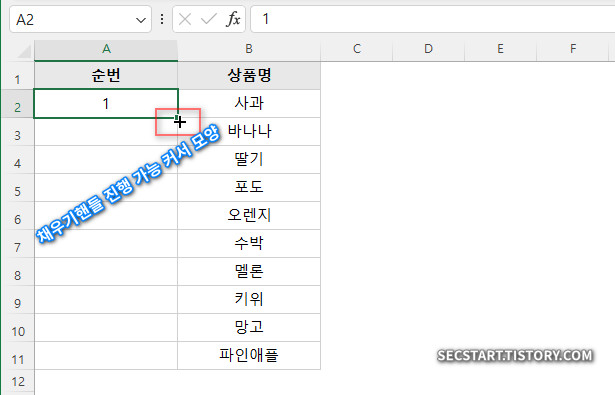 ㄷ. A2 셀을 다시 선택하고, 오른쪽 아래의 작은 네모 점(채우기 핸들)에 마우스 커서를 가져다 대면, 커서 모양이 얇은 십자가(+)로 바뀔 거예요.