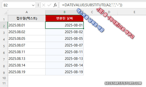 B2 셀에 아래 수식을 입력해 보세요. 점(.)을 하이픈(-)으로 바꾼 뒤 날짜로 변환하는 원리예요.