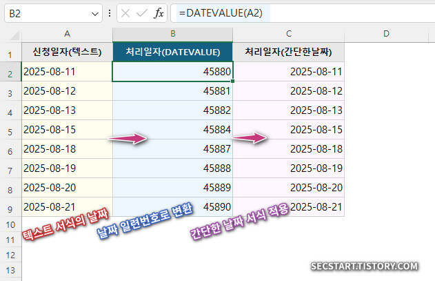 DATEVALUE 함수는 날짜처럼 생긴 텍스트(예: "2025-09-01")를 엑셀이 이해할 수 있는 바로 이 '날짜 일련번호'로 바꿔주는 역할을 합니다.