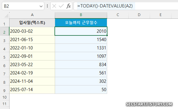 텍스트로 된 입사일 데이터를 바탕으로 오늘까지의 근무일수를 계산해볼까요? 오늘 날짜를 반환하는 TODAY 함수와 함께 사용하면 아주 유용해요.